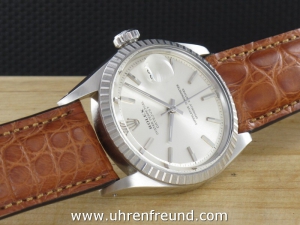 Original Oyster Perpetual Datejust Ref. 1603 mit Zifferblatt in silber und geriffelter Edelstahllünette aus dem Jahr II 1968. Das Gehäuse und Plexiglas befinden sich in sehr gutem Zustand und weisen beinah keine Gebrauchsspuren auf. An der Uhr befindet sich ein braunes Alligator Lederband welches neu und ungetragen ist. Das original Jubilèband wird mitgeliefert und kann gegebenenfalls auch getragen werden. Das Automatik Uhrwerk ist überholt, kontrolliert und läuft einwandfrei. Bei der Uhr handelt es sich um das Herrenmodell mit einem Durchmesser von 36 mm, welches auch sehr gerne von Damen getragen wird. Der Rolex Klassiker schlechhin! Die Lieferung erfolgt mit Serviceetui, Rechnung von Classic Watches und CW-Garantiezertifikat.