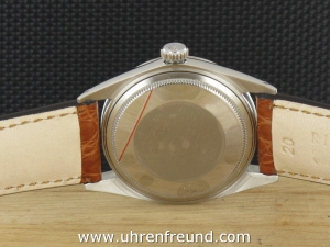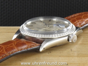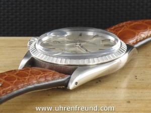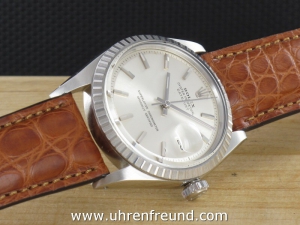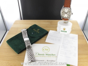 Original Oyster Perpetual Datejust Ref. 1603 mit Zifferblatt in silber und geriffelter Edelstahllünette aus dem Jahr II 1968. Das Gehäuse und Plexiglas befinden sich in sehr gutem Zustand und weisen beinah keine Gebrauchsspuren auf. An der Uhr befindet sich ein braunes Alligator Lederband welches neu und ungetragen ist. Das original Jubilèband wird mitgeliefert und kann gegebenenfalls auch getragen werden. Das Automatik Uhrwerk ist überholt, kontrolliert und läuft einwandfrei. Bei der Uhr handelt es sich um das Herrenmodell mit einem Durchmesser von 36 mm, welches auch sehr gerne von Damen getragen wird. Der Rolex Klassiker schlechhin! Die Lieferung erfolgt mit Serviceetui, Rechnung von Classic Watches und CW-Garantiezertifikat.